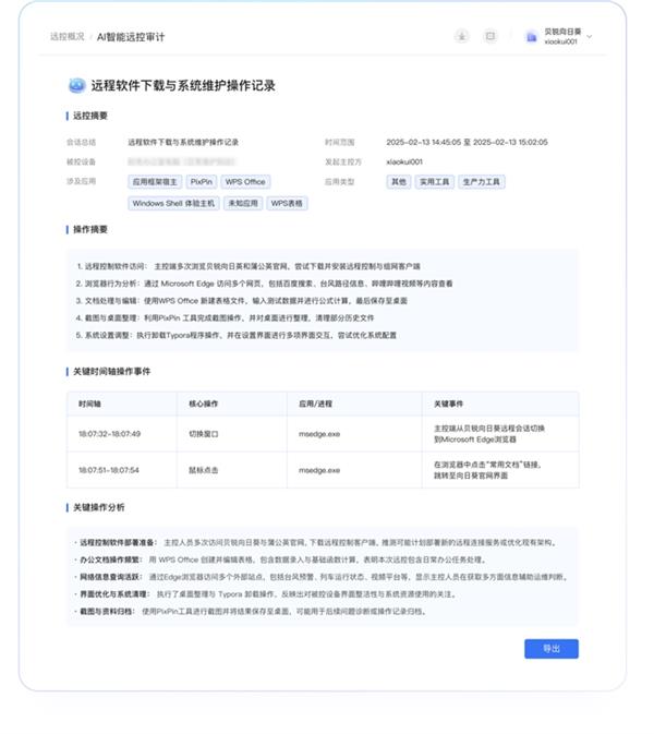 通过不竭融合AI手艺取可视化能力,向日葵小我版也供给了文件闪传、设备办理、无人值守远控等便利功能,无需额外客户端,也能实现近程电源节制,企业可快速发觉并处置毛病;而AI智能审计功能可对远控全过程进行阐发并从动生成演讲,